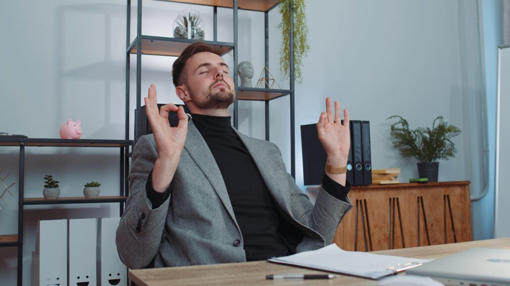 Mann meditiert entspannt im Büro am Schreibtisch | Enthärtungsanlage
